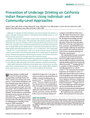 Prevention of Underage Drinking on California Indian Reservations Using Individual- and Community-Level Approaches by Roland S. Moore, PhD, David A. Gilder, MD, Joel W. Grube, PhD, Juliet P. Lee, PhD, Jennifer A. Geisler, RN, BA, Bettina Friese, PhD, Daniel J. Calac, MD, Laura J. Finan, PhD, and Cindy L. Ehlers, PhD